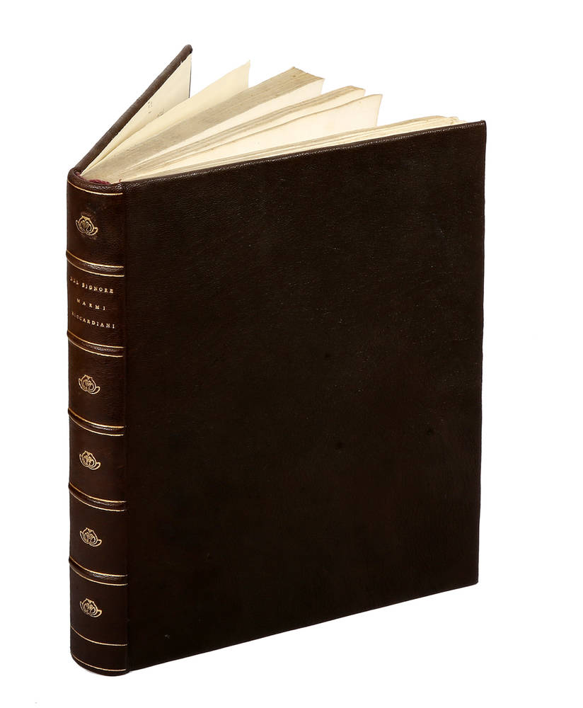 In-4° grande, pagine VIII, 340. Sotto il titolo, graziosa vignetta allegorica incisa in rame; a p.III dedica di Vincenzio e Ferdinando Riccardi de Marchesi di Chianni..."Ai Nobilissimi Giovinetti", con grande stemma gentilizio degli stessi marchesi. Legatura in marocchino moderno, dorso a 5 nervi e tit. oro. Bell'esemplare.