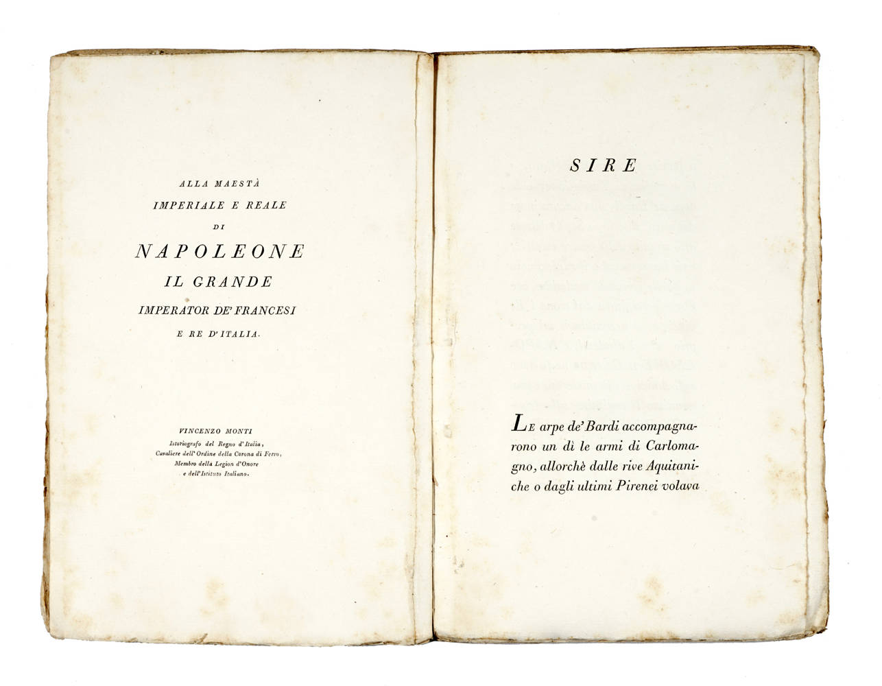 In-8° grande real-folio (mm 232x150), carte [3] (la prima bianca), pagine VIII, occhietto, 100 + carte [2] (l'ultima bianca). Dedica "Alla Maestà Imperiale e Reale di Napoleone il Grande Imperator de' Francesi e Re d'Italia". Cartone moderno. Esemplare intonso.