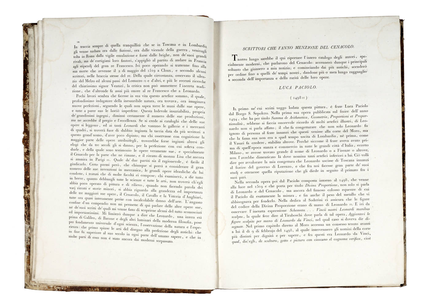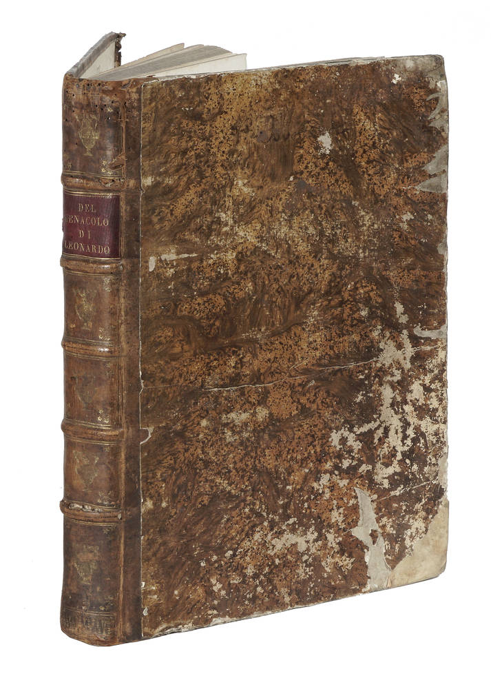 In-folio (mm 387x285), Pagine 263, [1], con 6 tavv. tratte da disegni leonardeschi fuori testo incisi all'acquaforte in sanguigna da G. Longhi, G. Benaglia e Fr. Rosaspina in fine. Lievi gore marginali a poche carte iniziali e finali .Mancante del ritratto di Leonardo in antiporta. Legatura in mezza pelle coeva, con punte in pergamena, dorso a 5 nervi, piatti un poco lisi. Buon esemplare.