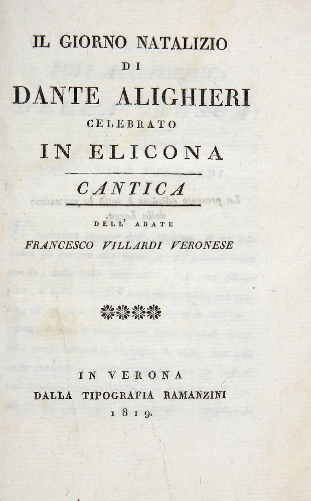 Edizione originale, non comune di questo curioso poema in 4 canti, all'uso dantesco. Nell'ultimo si parla del Gozzi, del Bettinelli "pazza censura", del Giordano, dell'Alfieri che dà fuoco aiutato da altri sommi, ad un mucchio enorme di altrui poesie da sottobosco letterario, mentre Omero, Virgilio, il Tasso e tutti gridano "Viva Dante" e via di questo passo.