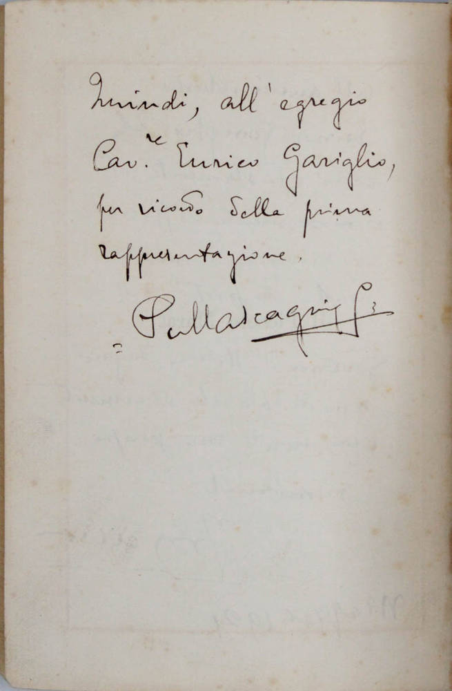 In-16°, pagine 100. Brossura editoriale. In antiporta dedica autografa a Enrico Gariglio datata "Maggio 1921"; al verso dell'antiporta, dedica autografa di Pietro Mascagni a E. Gariglio.