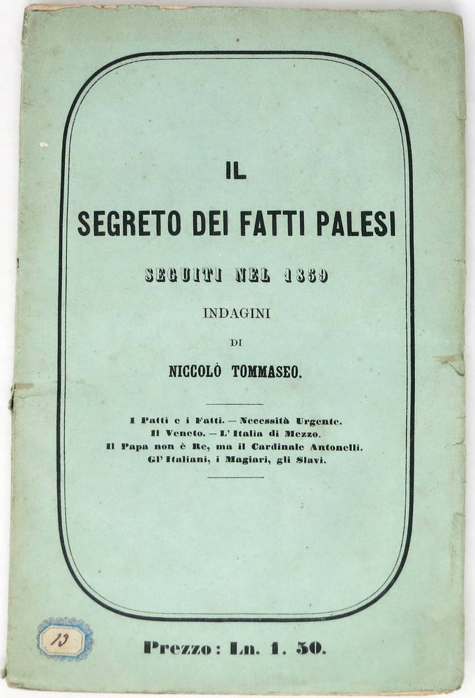 Edizione originale assai rara, sconosciuta a Parenti. "Più che un sunto storico degli avvenimenti del memorabile anno 1859, queste pagine contengono le considerazioni di un grande intelletto e di una grande anima, sulle cause e sugli effetti di quegli avvenimenti, profezie di un cieco veggente, ammonimenti a Italiani e stranieri". (Cfr. Ann. Bibliogr. Barbera, n.79). Tecchio-Poletti, 74.