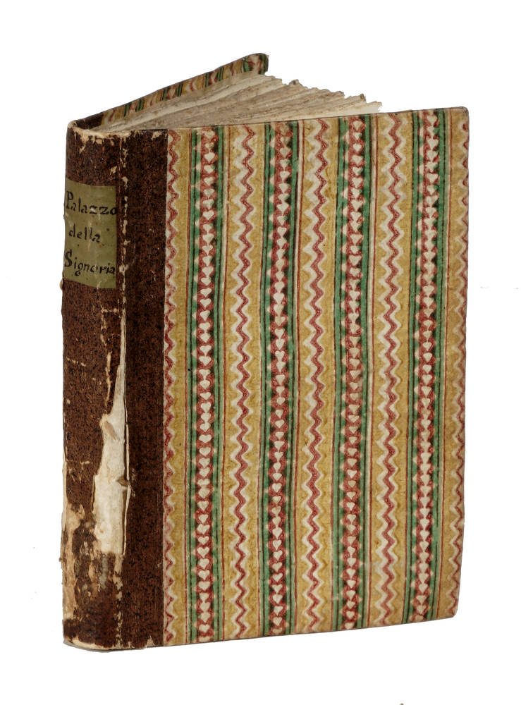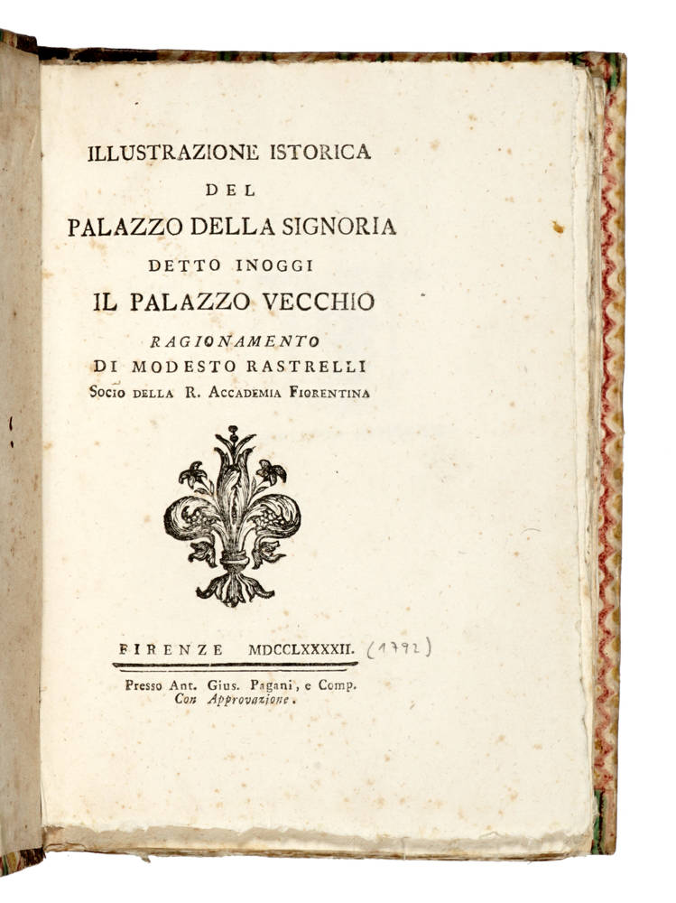 Edizione originale della prima storia e guida del celebre Palazzo Vecchio. Fossati-Bellani, 3102. Lozzi, 1927 (nota). Moreni II, 229: "Avea tutto il merito questo insigne Palazzo di essere illustrato in tutte le sue parti, giacchè contiene in se dei rari monumenti nelle Belle Arti e ravviva la memoria di fatti strepitosissimi ivi occorsi in più, e diversi tempi". Assai raro.
