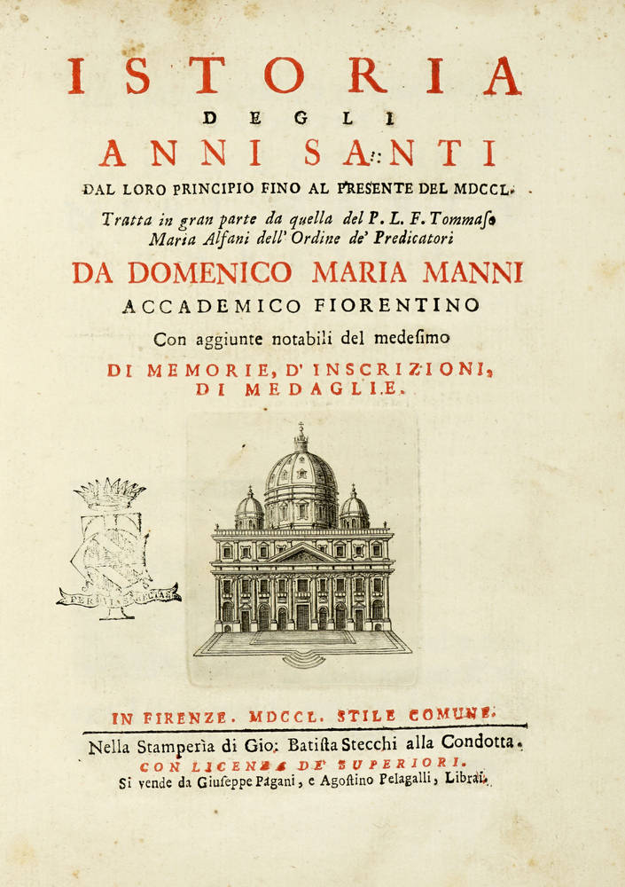 Istoria degli Anni Santi dal loro principio fino al presente del MDCCL. Tommaso Maria Alfani..., con aggiunte notabili del medesimo di memorie, d'iscrizioni, di medaglie.
