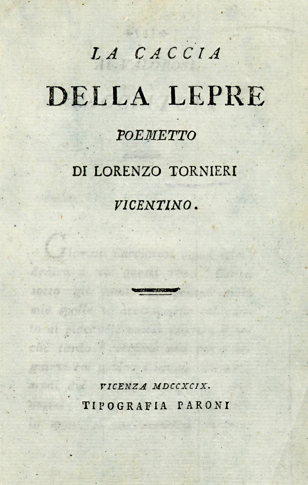 Ceresoli, 524: "Edizione originale...È l'ultimo dei poemetti venatori dell'autore. Consta di due canti, rispettivamente di 71 e 67 ottave, con annotazioni in fine di ciascuno di essi. È assai lodato da Bacchi della Lega ed è anche ritenuto la migliore delle opere del Tornieri". Schwerdt II, 264, erra nell'indicare, come prima, l'edizione del 1802.
