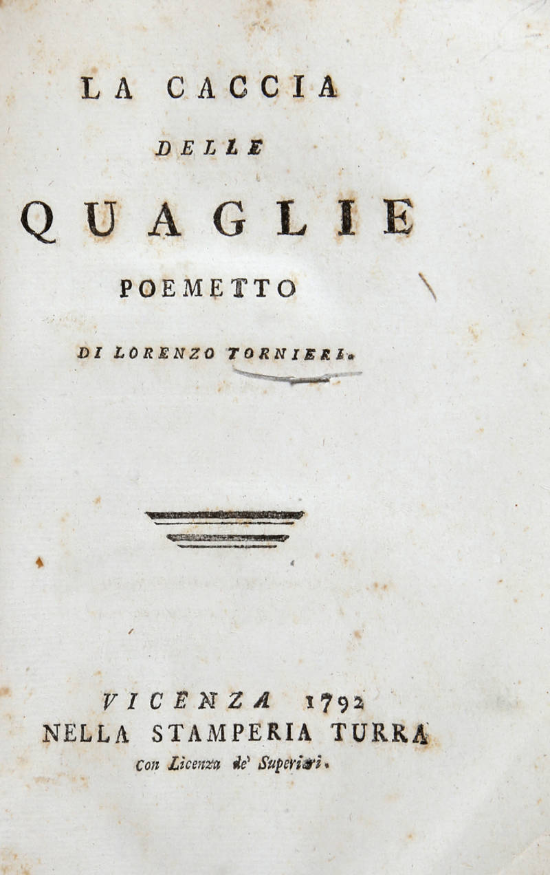 Edizione originale. Ceresoli, 524: "Edizione originale, della quale esistono pure esemplari in carta azzurrina. È il secondo dei poemetti venatori di questo autore; consta di due canti, di 75 ottave il primo e di 78 il secondo...lodata assai dal Bacchi della Lega". Souhart, 465. Schwerdt II, 264.