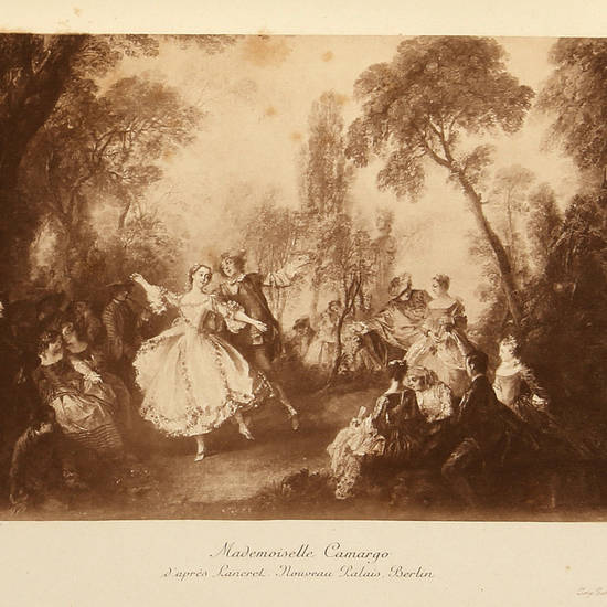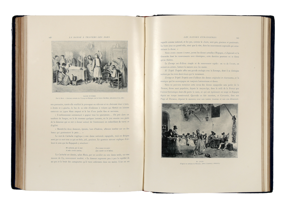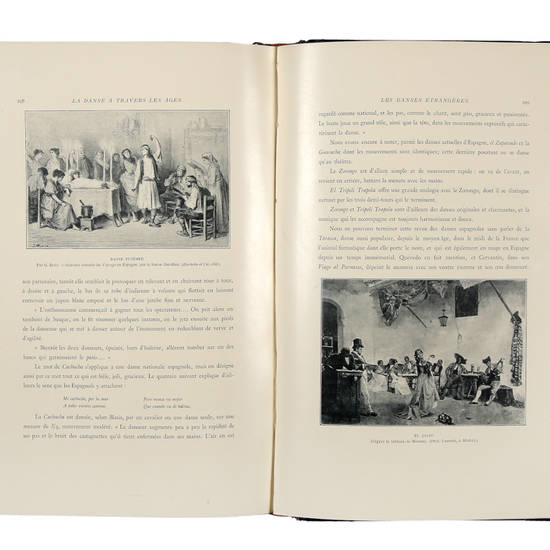 In-4° (mm 301x207), pagine VIII, 390, [1], con numerose tavole fuori testo, in nero, bistrò, dai migliori dipinti e incisioni dei varii secoli di musica, etc. Bellissima legatura coeva in pieno marocchino azzurro con titolo oro e a colori al piatto anteriore e sul dorso; sul piatto post., impress. a freddo, sguardie marmorizzate, taglio dorato. Bellissimo esemplare.
