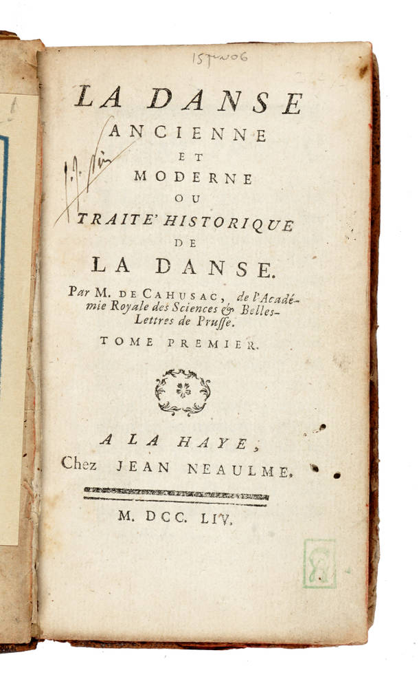 Prima ed unica edizione del più importante trattato, volto a rinnovare il concetto del balletto e dell'arte lirica. L. de Cahusac (Montauban 1706-Parigi 1759), librettista di Rameau e redattore per l'Encyclopédie di Diderot, fu il primo teorico francese a difendere l'idea che la danza può divenire uno spettacolo "parlante". Cahusac apportò attenzione particolare alla pantomima come risorsa di rinnovo teatrale, tanto che la disciplina della danza è ravvisata come una "imitazione della natura". Si occupò anche di feste e spettacoli pubblici, di macchine teatrali e di scenografia. (Cfr. Beaumont, 53).