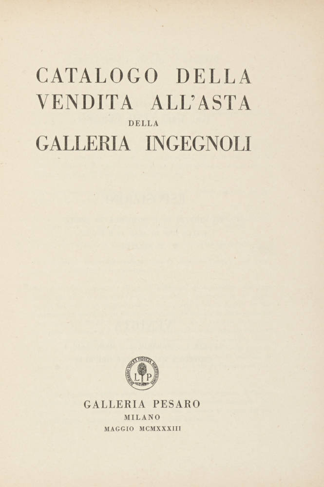In-4° (mm 295x222), Pagine 25 e 191 tavole fuori testo in nero e a colori. CATALOGO della Vendita all'asta della Galleria Ingegnoli. Milano, Galleria Pesaro, 1933. In-4°, pagine 38. Legatura in tela editoriale.
