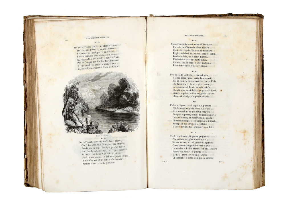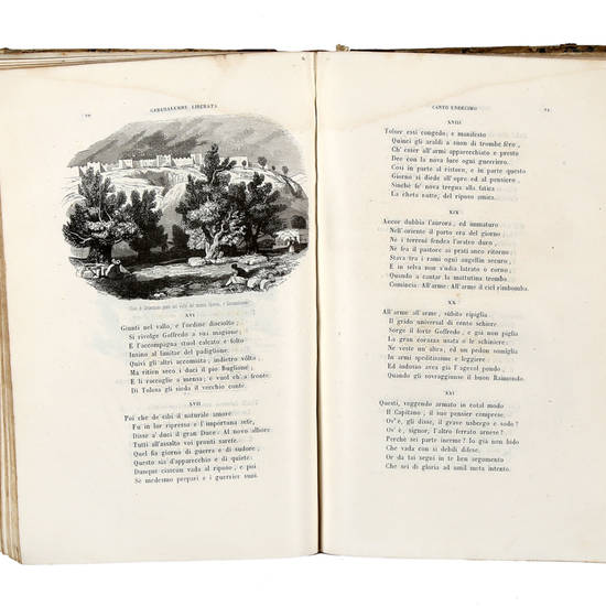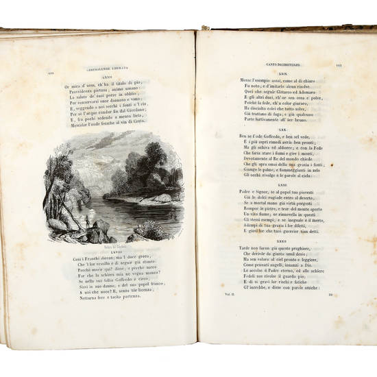 2 parti in 1 volume in-8° (mm 260x165), pagine XCIV (Vita del Tasso), [2], 278 + 1 carta bianca; 384. Senza il ritratto del Tasso in antiporta. Frontespizio figurato inc. da Basile, 2 carte geografiche fuori testo e centinaia di vignette e fregi, inc. da Ratti, Vajani, Lecurieux ed altri artisti dell'epoca. Legatura in mezza pelle coeva, piatti marmorizzati con punte lise, dorso con tit. e fregi oro. Esemplare mediocre, con aloni di gore d'acqua nella parte superiore, più accentutata in alcuni punti. Altri lievi difetti.