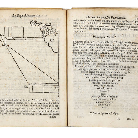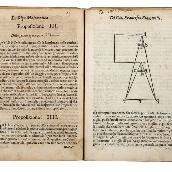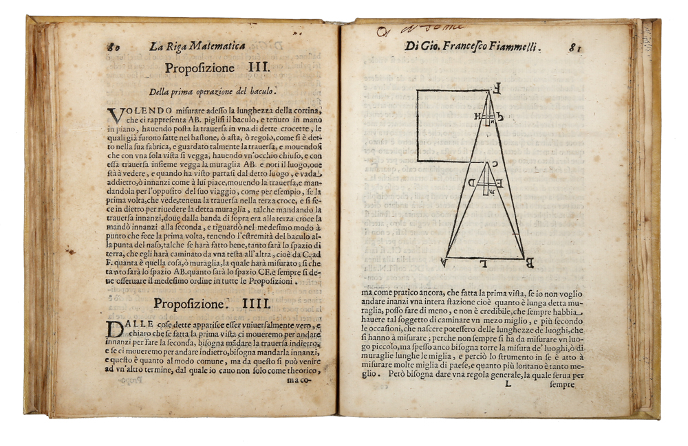 S'insegna ancora ad operare gli Strumenti di più sorti, con la composizione d'un nuovo strumento, il quale serve per tutti gli strumenti: e un nuovo modo di misurar la terra, e un ordine di levar piante senza essere conosciuto quello si vuol fare se l'huomo fosse preso da nimici. Edizione originale di questo raro libretto. La Riga è un rozzo strumento di agrimensura che poteva dare qualche buon risultato solo nei rilievi approssimativi o a vista, per gli usi militari. Riccardi I, 453-54. Parenti, 226. Gamba, 1920. D'Ayala, 98. Vinciana, 1650: "Unica ediz.".