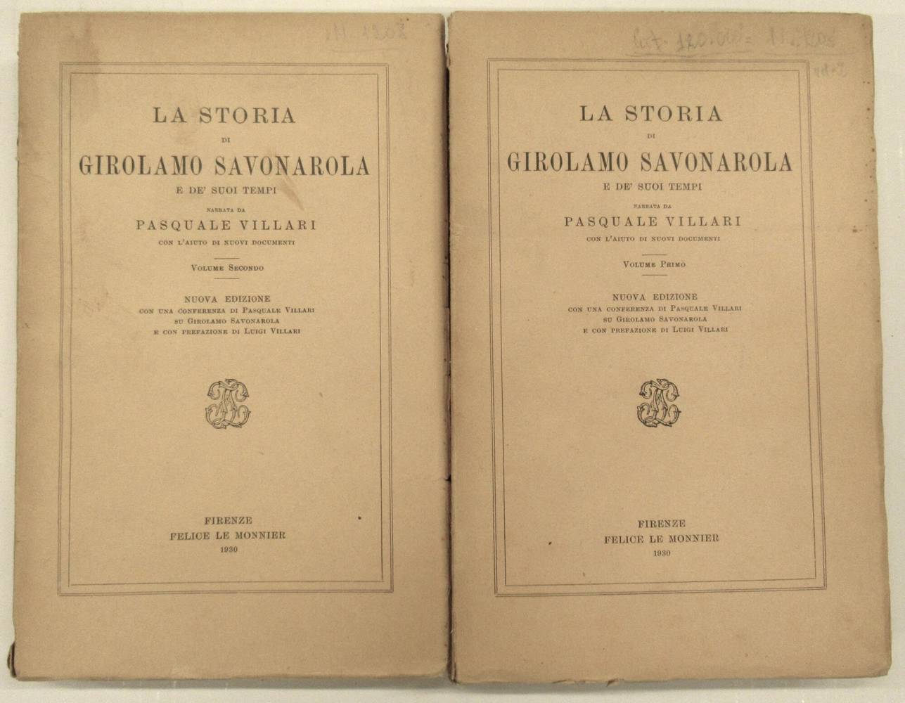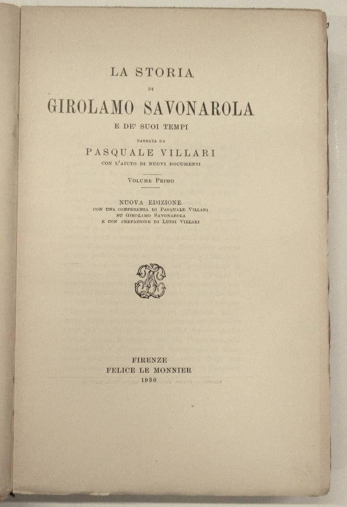 La storia di Girolamo Savonarola e de' suoi tempi...Nuova edizione con una conferenza di Pasquale Villari su Girolamo Savonarola e una Prefazione di Luigi Villari.
