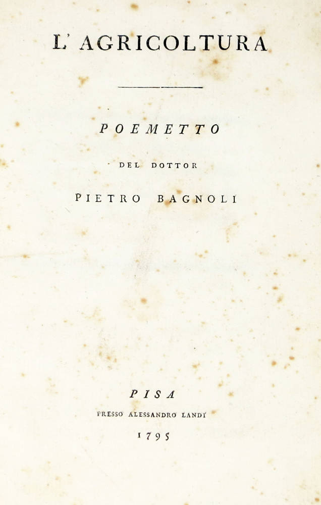 Edizione originale della sua prima opera, assai rara. Parenti, Rarità Bibl. dell'Ottocento II, 18-19. BAGNOLI P. (1767-1847), abate di S. Miniato, fu poeta.