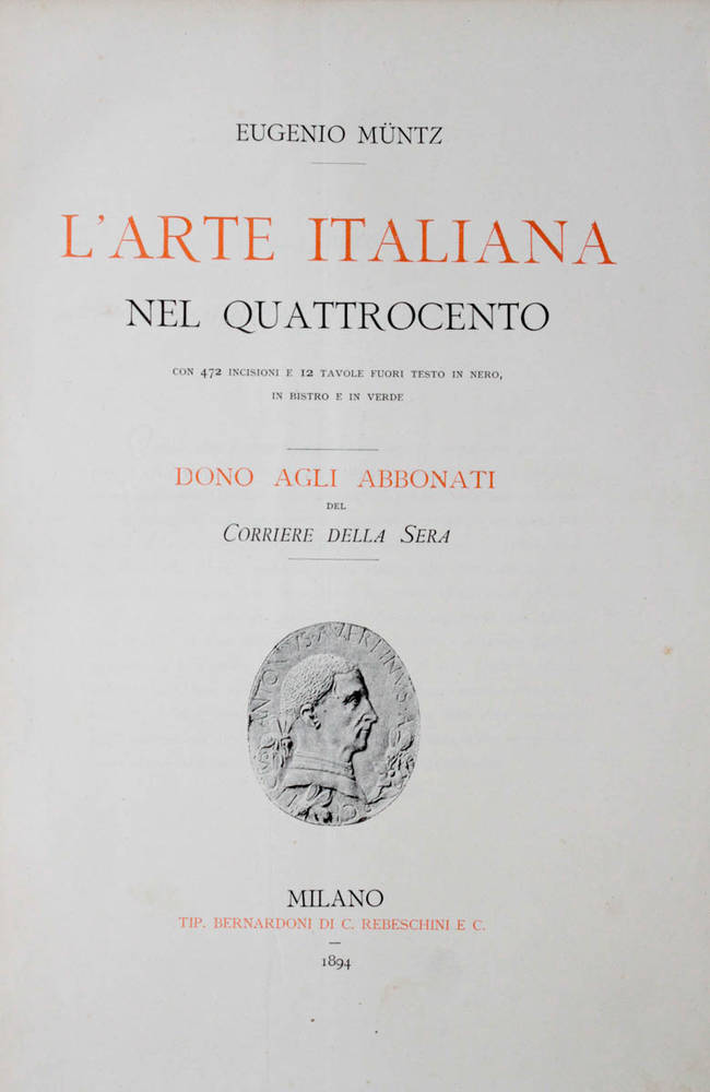 In-8° grande, pagine [6], 718 con 472 inc. e 12 tavole fuori testo in nero, in bistro e in verde. Legatura editoriale in tutta tela, dorso decorato in oro. (Si unisce:) Idem. id. L'età aurea dell'arte italiana (seguito all'Arte italiana nel Quattrocento). Milano, Tip. del Corriere della Sera, 1895. In-8° grande, pagine [6], 622 con 420 inc. e 20 tavole fuori testo in nero, bistro e cenere. Legatura editoriale in tutta tela, dorso decorato in oro, piatto ant. fig.