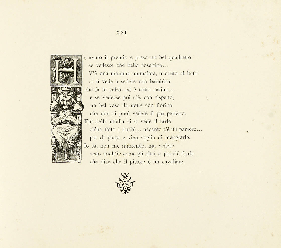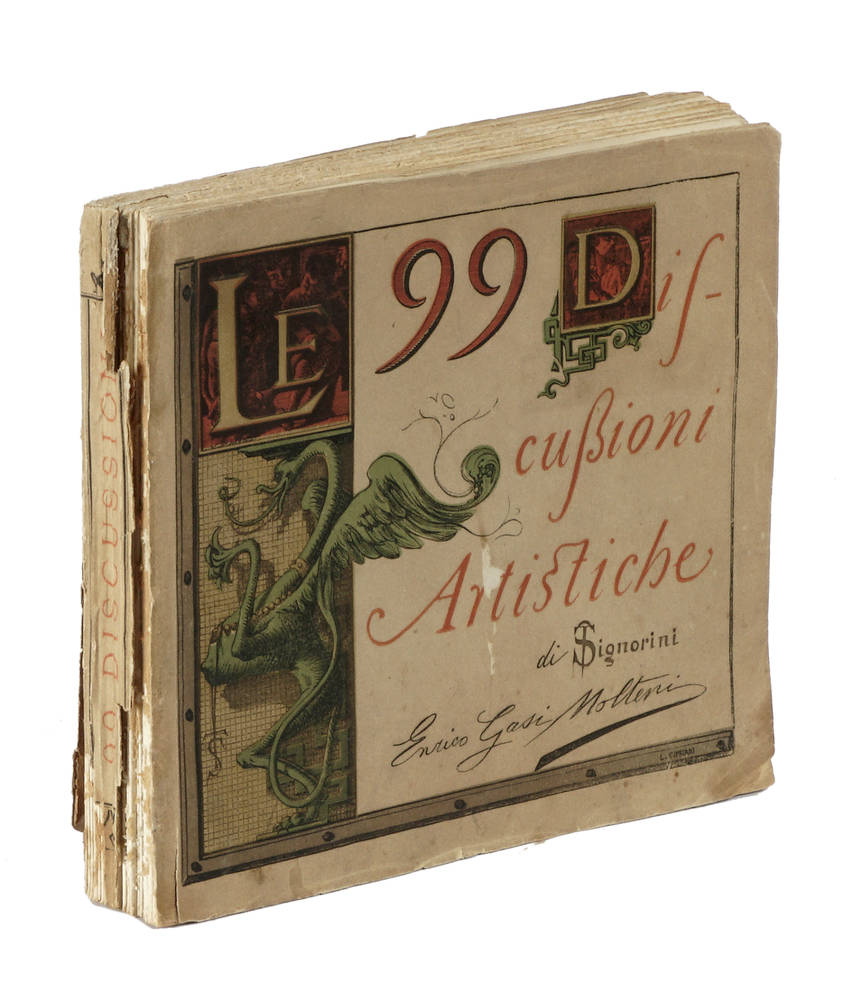 Rarissimo e molto ricercato. Le sei carte preliminari contengono: occhietto, frontespizio, caricatura (opera di Giovanni Boldini), citazione da Moliere, "A chi legge". Su ogni pagina pari del testo è il titolo (con iniziali decorate) del sonetto (sono 99 composizioni) stampato sempre sulla seguente dispari. Ogni poesia ha un'iniziale con fregio e figura, più volte ripetuto, ed in basso una piccola decorazione tipografica. La copertina figurata è a quattro colori. Inutile aggiungere che gli interessantissimi fregi, anche a più figure, sono opere del Signorini, come pure la copertina, dove appare il nome dell'incisore L. Cipriani. Enrico Gasi Molteni è l'anagramma di T. Signorini il quale, nel dubbio che non si capisse, ha firmato anche col suo vero nome sulla sola copertina.