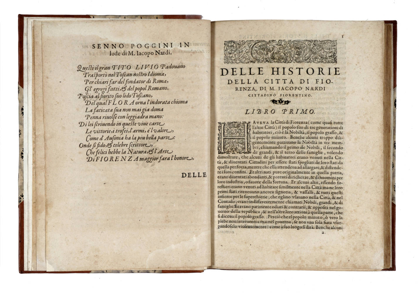 In-4°(mm 240x175), Carte [4], Carte 232 + Carte [36]. Titolo inquadrato in bella cornice ornamentale in ovale, con lievi restauri nei margini, iniziali xilografiche ornate. Legatura in mezza pelle moderna piatti marmorizzati con ampie punte. Arrossatura sparse dovute alla carta dell'epoca, in alcuni punti più accentuate ma comunque esemplare in condizioni accettabili.