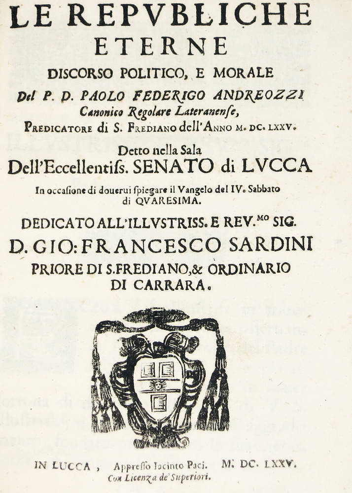 Le Republiche Eterne. Discorso politico, e morale, detto nella Sala dell'Ecc.mo Senato di Lucca in occasione di doversi spiegare il Vangelo del IV. sabbato di Quaresima...