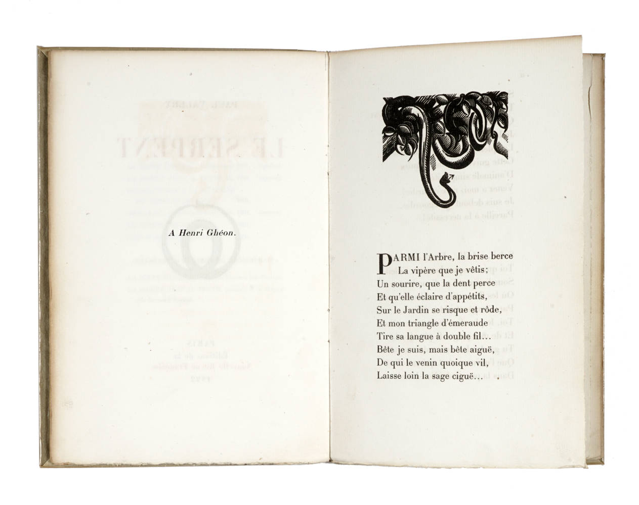 Esemplare N° 231dei 300 stampati su vergé pur fil Lafuma, arricchito dalla dedica a penna del celebre poeta francese. Rara edizione originale del poemetto Le serpent, successivamente incluso in Charmes (col titolo di Ebauche d'un serpent).