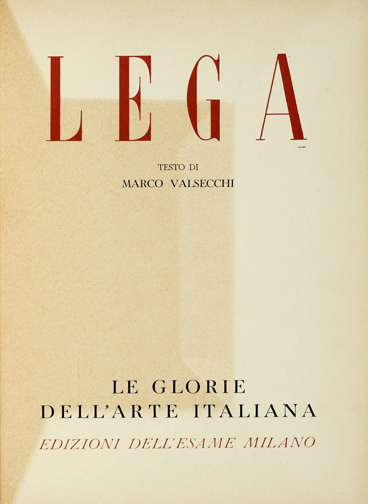 In-4° (mm 340x245), pagine 6, con 10 tavole a colori fuori testo montate su cartonc. (Curiosità, Lettura all'aperto, La veglia, Scialle rosa, Paesaggio del Gabbro, Profilo di popolana, Maternità, Lettura romantica, La Ciociara, Portatrici a Modigliana) e 2 tavole applicate nel testo da diss.(Strada alberata e Paese con figure), 1 ritratto fotogr. e firma autogr. di S. Lega in antiporta. Cartonato editoriale figurato. Bellissimo esemplare.