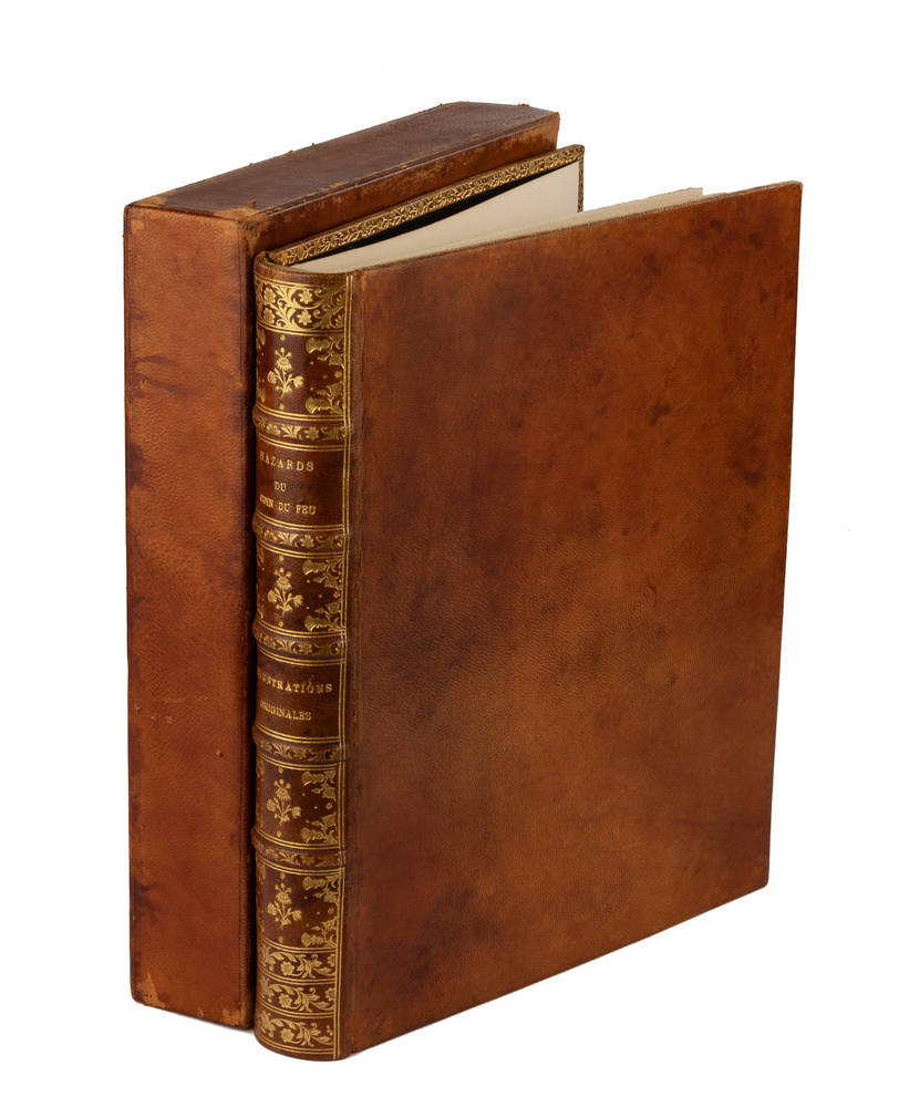 In-8 grande (mm 275x215), Carte VI e Carte 35 numerate a matita dall'autore con 45 illustrazioni originali a tempera, alcune firmate " ALI' R", realizzate su cartoncino ed applicate alle carte. Brossura originale con sovracopertina in pelle, dorso ampiamente decorato oro, sguardie in seta, custodia pure in pelle.