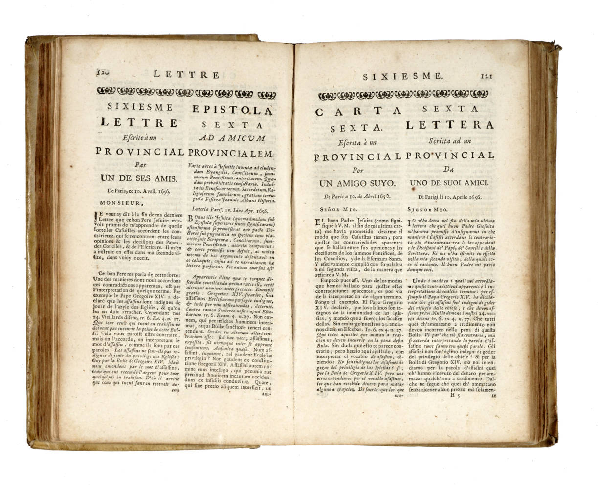 Edizione assai pregiata, in quattro lingue, poco conosciuta ai repertori bibliografici. B. Pascal (Clermont-Ferrand 1623-1662), matematico, fisico e filosofo, fu il più grande prosatore francese del suo tempo. Egli è ricordato principalmente come moralista, specialmente come grande apologista del Giansenismo, movimento ascetico francese del XVII sec., di riforma all'interno della chiesa romana cattolica. La sorella di Pascal, Jacquelin, divenne suora nel famoso monastero di Port Royal, al centro del movimento, dove Pascal dopo essersi convertito nell'autunno del 1654, andò a vivere in completa reclusione. Alla fine del 1655, il movimento fu duramente attaccato dai Gesuiti e Pascal fu persuaso a scrivere una replica. Il principale terreno di attacco da parte dei Gesuiti, fu la dottrina del giansenismo, considerata pericolosa ed avvicinata alla dottrina Calvinista della predestinazione. Il contrattacco di Pascal prese la forma di una brillante ed eroica esposizione dei casuistici metodi di argomentazione dei Gesuiti e di una nobile difesa del pensiero della fede religiosa. Le Lettres Provinciales riguardano soprattutto due questioni: la grazia divina ed il codice etico dei Gesuiti. L'opera fu messa all'Indice e venne ordinato dal Consiglio Reale, di metterla al rogo.