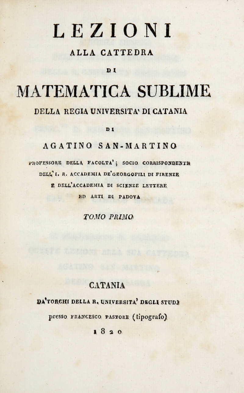 Lezioni alla Cattedra di Matematica Sublime della Regia Università di Catania.