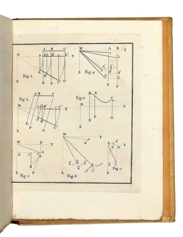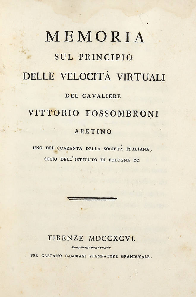 Edizione originale, molto rara. Brunet II, 1355: "C'est dans ce mémoire que, pour la première fois, le principe mécanique des vitesses virtuelles a été exactement démontré. Les exemplaires en sont raresé. Verne-Ivy, Bibl. méchanica, 117. Poggendorf I, 779: "L'intento di Fossombroni, fu di tradurre la formulazione Galileiana delle velocità virtuali nel linguaggio algebrico della 'Meccanica analitica' di Lagrange e di applicarle a problemi pratici di idraulica. La sua opera contiene anche esposizioni sulla idrodinamica di Bernoulli, sugli studi idraulici di d'Alembert ed Euler e la 'Nuova Architettura idraulica' di Prony".