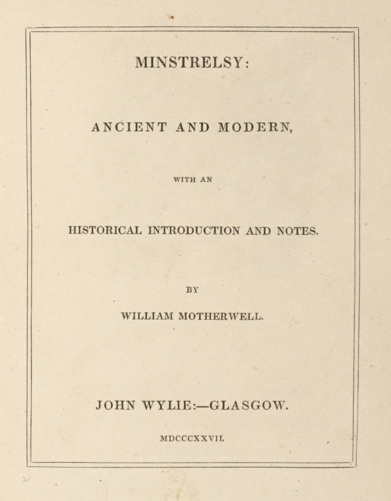 Importante raccolta di notizie di storia e letteratura scozzese, contenente la biografia di poeti ed artisti scozzesi dei secoli XVI-XIX°. W. Motherwell (1797-1835) di Glasgow, fu poeta, antiquario, storico e giornalista.