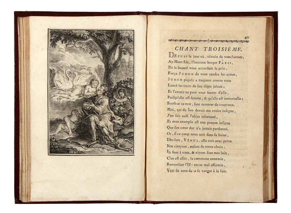Edizione originale. Barbier III, 396. Gay V, 179. Cohen-Ricci, 672: "X, 112, plus 1 titre par Eisen, gravé par de Ghendt, et 4 figures de Gabriel de Saint-Aubin, gravées par Massard (la 3.e n'est pas signée)". Choix, 2954.