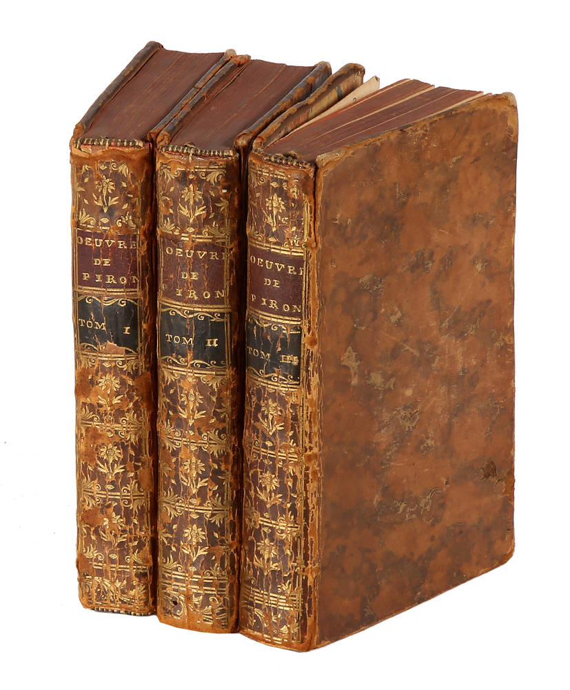 3 volumi in-12° (mm 156x90), carte [4], pagine 386 (numerate I-LXIII, poi 64-386); 387-492, LXXXVIII, 204; 205-584, 13, [1]. Con 7 tavole fuori testo incise da Filipart e Sornique. Legatura in pieno vitello coevo marmorizz., tagli in rosso, dorsi un po' lisi. Fori di tarlo nel marg. di poche pagine del vol.II che non ledono il testo, ma buon esemplare.