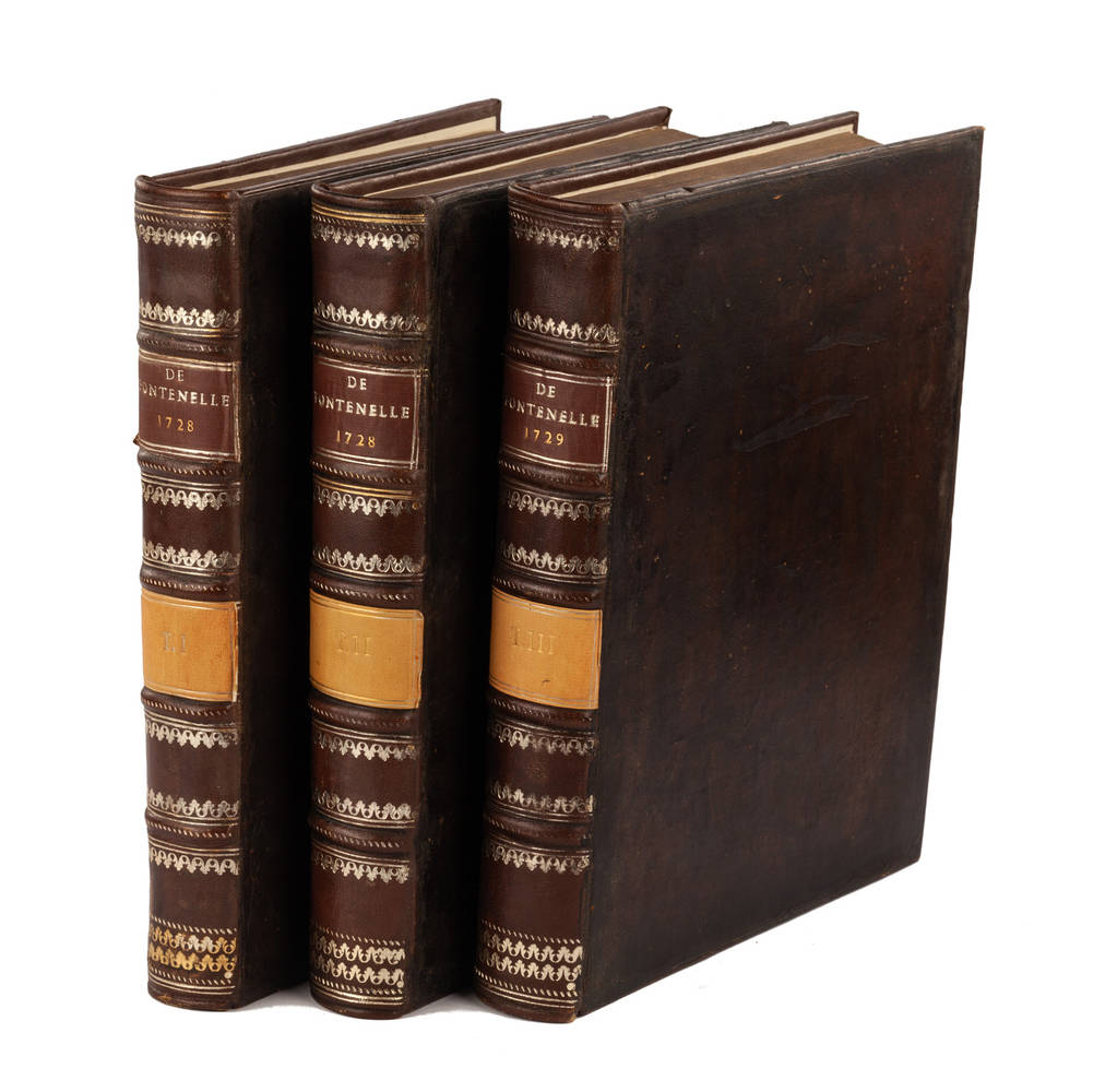 Cohen-Ricci, 407-408: "Superbes illustrations". Il volume I è pieno di elogi agli uomini illustri, quali Bernouilli, Du Hamel, Regis, Tournefort, Guglielmini, Cassini, Poli, Lemery, Malebranche, Leibniz, Newton, Viviani, etc. Il volume II contiene: Poesies Pastorales-Poesie Diverses-Lettres Galantes-Oeuvres Melées. Il volume III continua con gli elogi agli uomini illustri.