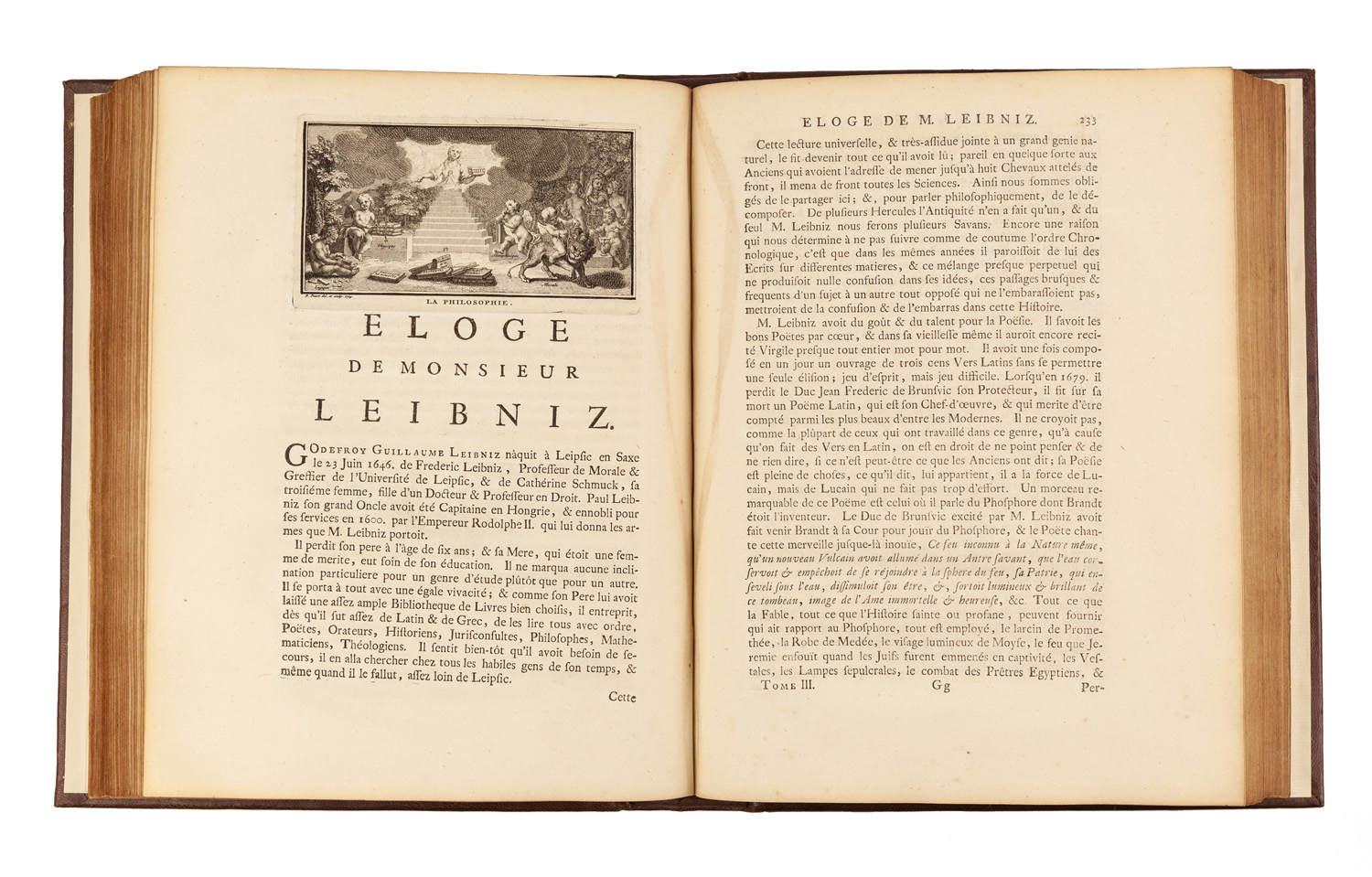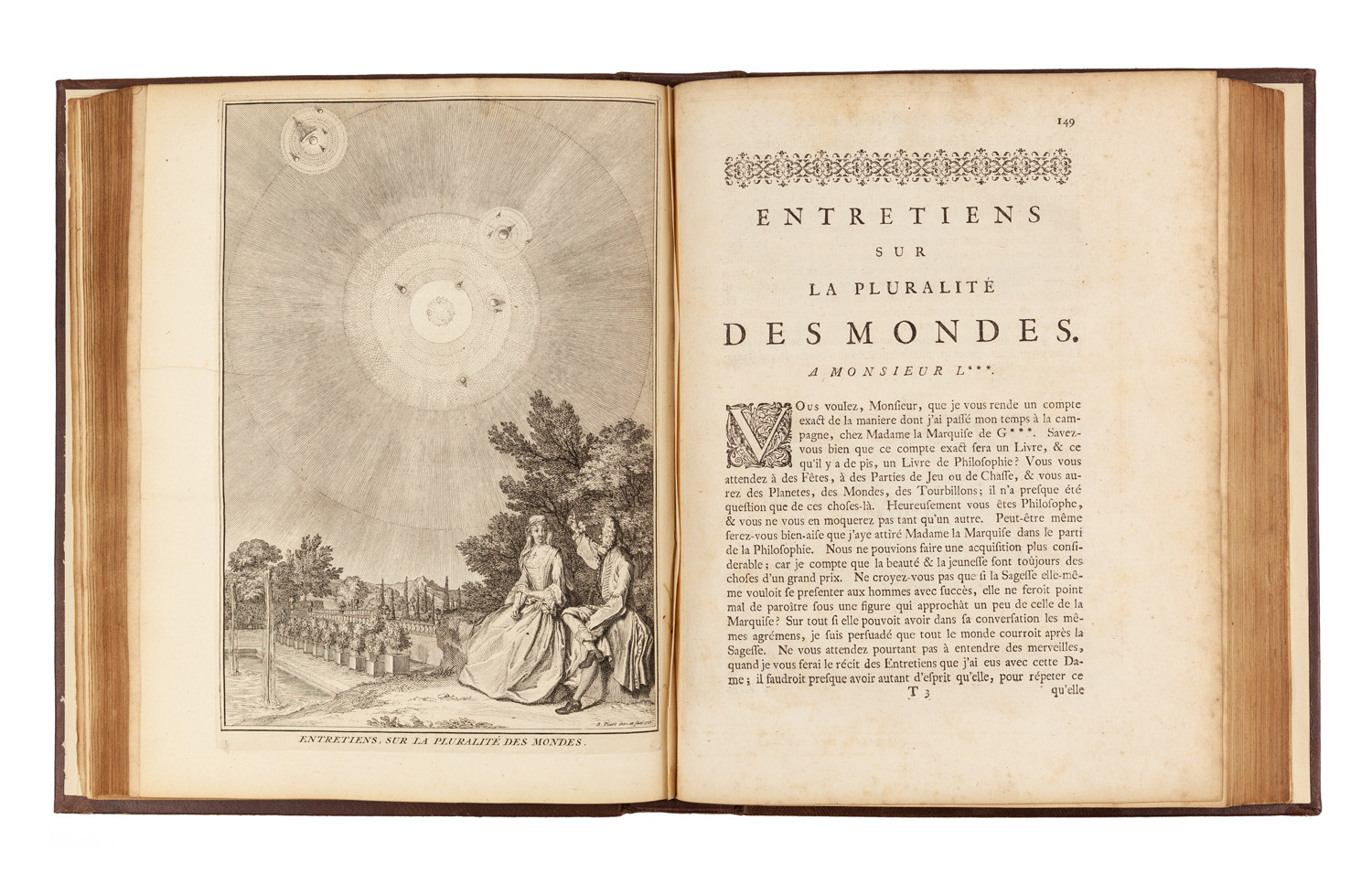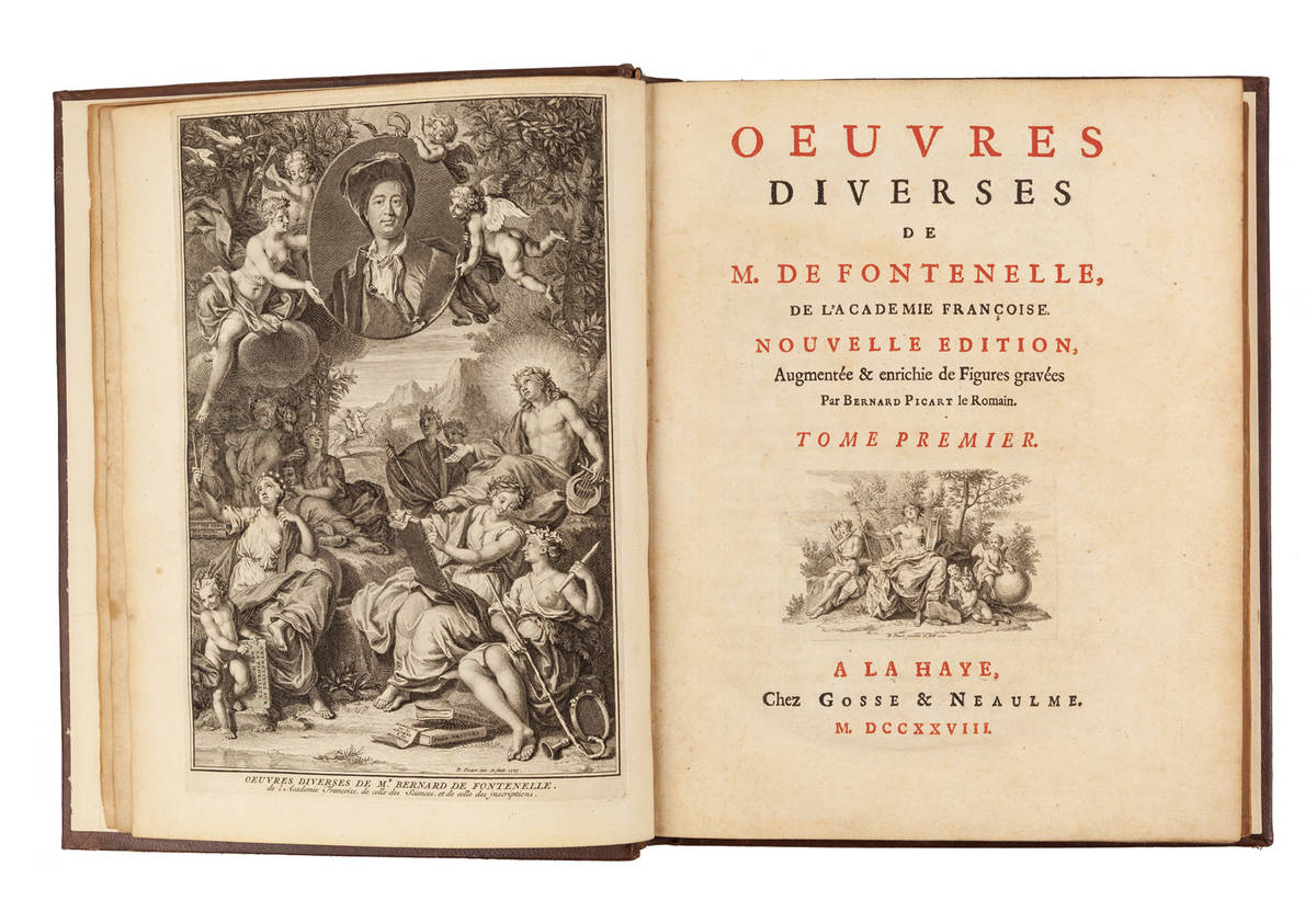 3 volumi in-4° ( mm 277x218), Carte [4], Pagine 376; Carte [4], Pagine 440; Carte [3], Pagine 434. Titoli in rosso e nero, 6 bellissime tavole fuori testo a piena pagina, di cui 1 col ritratto, 174 vignette e culs-de lamps, inc. da B. Picart. Esemplare con lievi minime arrossature alle prime pagine iniziali ma internamente in buono stato di conservazione.Legatura in marocchino coevo con rifacimento dei dorsi a 5 nervi in pelle moderna con titoli e fregi, piatti con alcuni restauri e sguardie rinnovate.