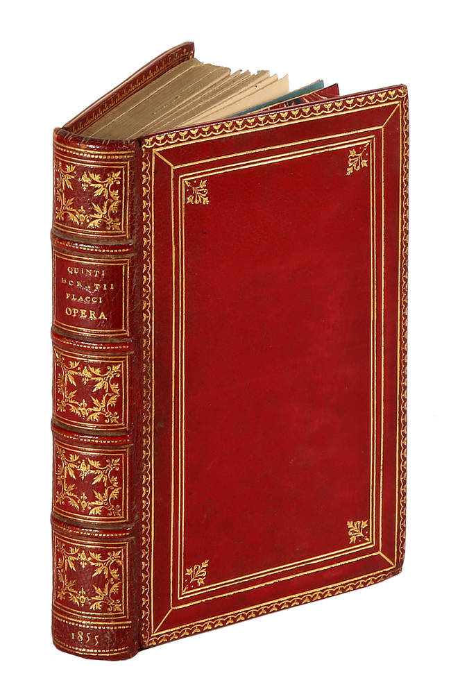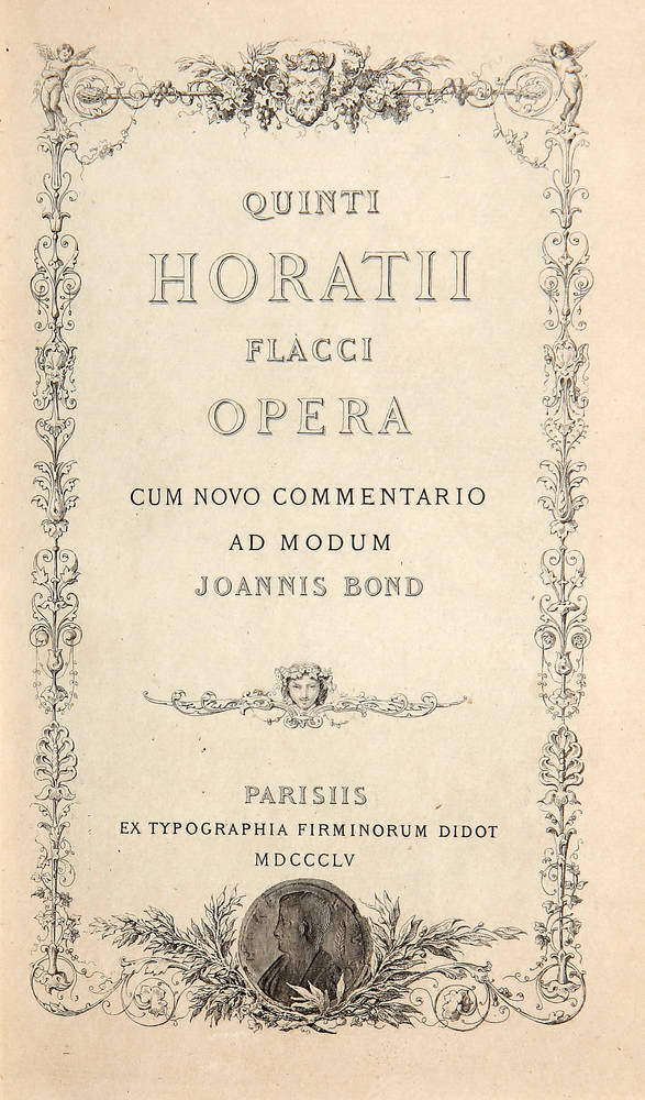 Nitidissima, accurata edizione. Il testo in latino è inquadrato dal commento e la pagina è in una cornice tipografica. Graziosissima la vignetta al principio delle poesie, incisa da Huyot su disegno di Barrias.