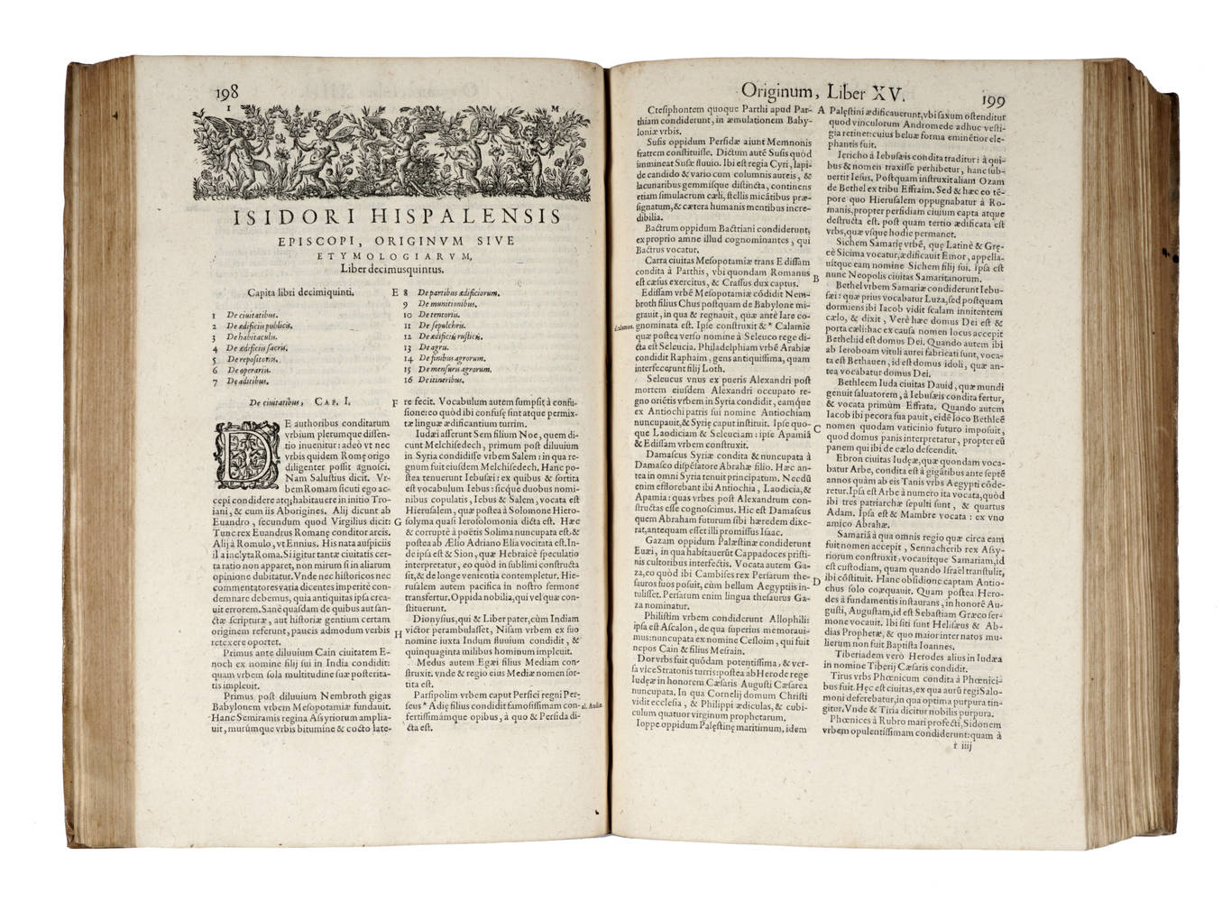In-fol. (mm 350x220), Pagine (32), 975, (101) con Frontespizio in rosso e nero e con Marca xilografica, testate, iniziali e finalini xilografici. Con alcune figure xilografiche nel testo. Testo su 2 colonne ( corsivo e romano). Forellini di tarlo nel margine interno centrale che non toccano il testo fra le pagine 550-575; Gore d'acqua intense nel margine inferiore delle ultime 10 carte finali, alcune arrossature sparse ma buon esemplare. Legatura coeva in pergamena rigida un poco allentata al piatto anteriore, dorso a 4 nervi con piccole mancanze di pergamena ai nervi; titolo manoscritto al dorso.