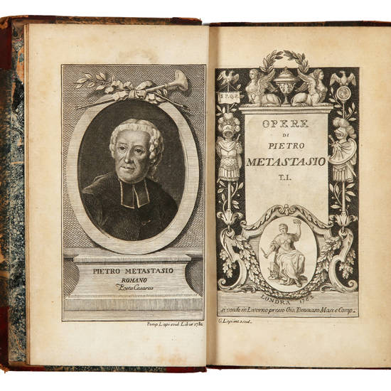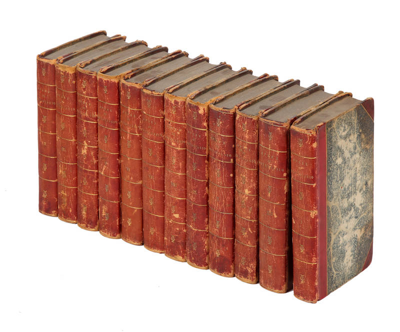 12 volumi in-12° (mm 152x85) con ritr., 12 frontespizi figurati e 36 tavole fuori testo incise in rame da Gio. Lapi. Legatura in mezza pelle coeva con punte, piatti e sguardie marmorizzate, dorsi decorati in oro. Ottimo esemplare.