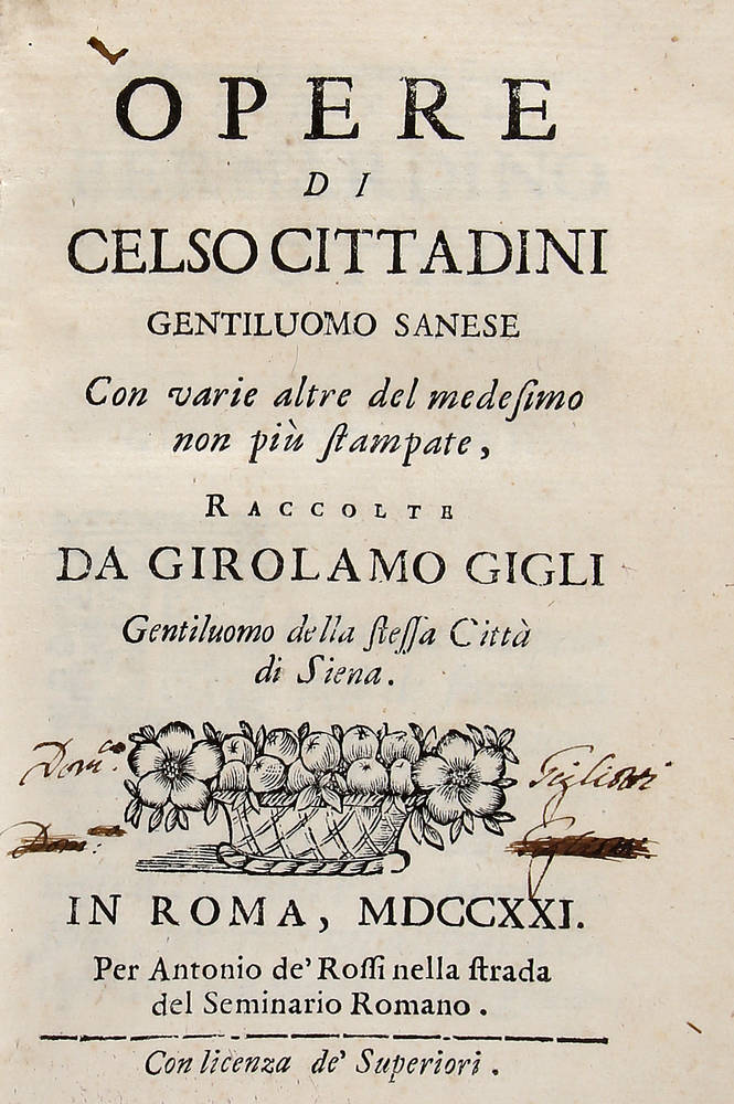 Edizione originale, non comune. Gamba, 1888: "Girolamo Gigli dedicò questa riputata edizione al card. Bernardini Scotti...e v'ha anche premesse le notizie dell'Autore. Contiene soltanto le Opere grammaticali del Cittadini, ed è frequentemente citata nel Dizionario Enciclopedico dell'Alberti...".