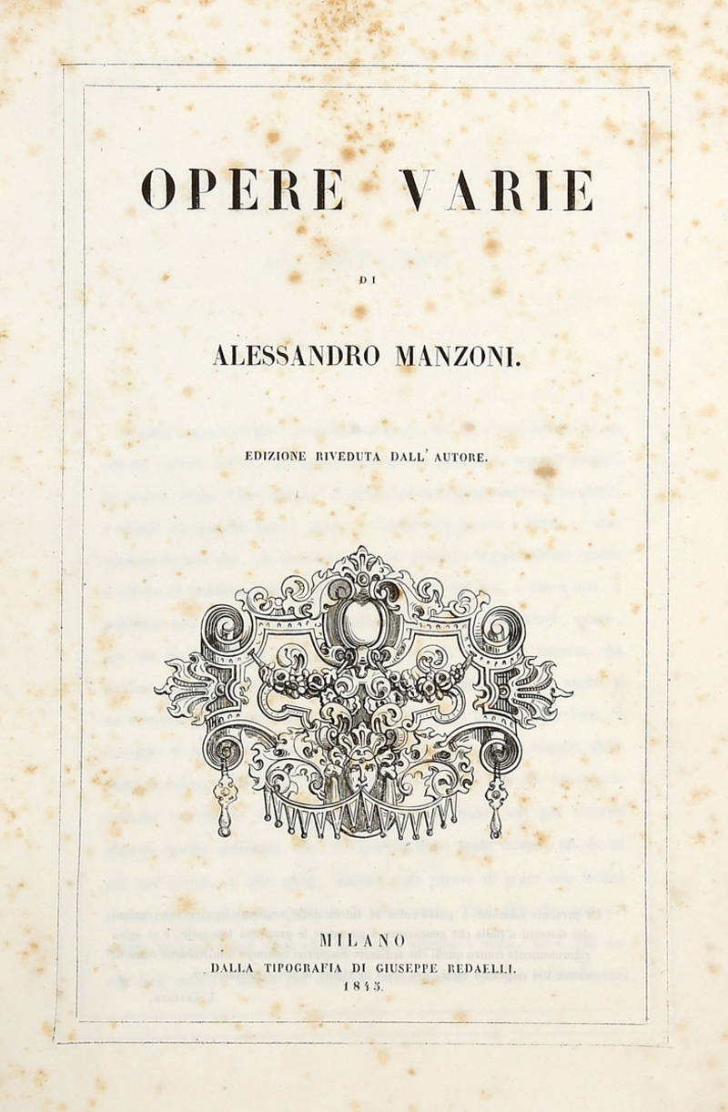 Vismara, 329: "Venne pubblicata in 9 fascicoli...Fa seguito al volume I Promessi Sposi, pubblicati nel 1840-42 dalla tipografia Guglielmini e Radaelli, con tipi e carta uguale. Questo volume contiene: Adelchi-Discorso sopra alcuni punti della storia longobardica in Italia-Il Conte di Carmagnola-Lettre à M.C+++ sur l'unité de temps et de lieu dans la tragèdie, etc.-Del romanzo storico e, in genere, de' componimenti misti di storia e d'invenzione-Dell'invenzione, dialogo-Sulla lingua italiana, lettera a G. Carena-Osservazioni sulla morale cattolica-Inni sacri-Strofe per una prima comunione-Cinque maggio". Salveraglio, n. 9. Parenti (Rarità) I, 230 e segg. descrive minuziosamente questa importante edizione delle Opere; dichiarando, in fine: "Non ci meravigli, per altro, di trovare qualche esemplare di queste Opere varie, costituito di 878 pagine; ed eccone la ragione. Nel 1860, il Manzoni pensò di aggiungere al volume anche il Marzo 1821 e il Proclama di Rimini, che aveva pubblicati nel 1848, e fece uscire una nuova dispensa contenente le segnature 108 e 109 (numerate da (863 a 878)...".