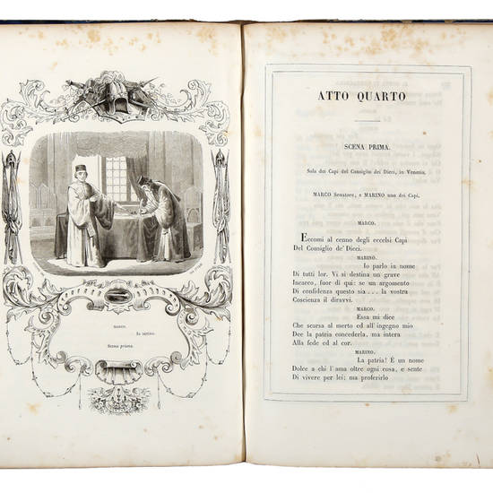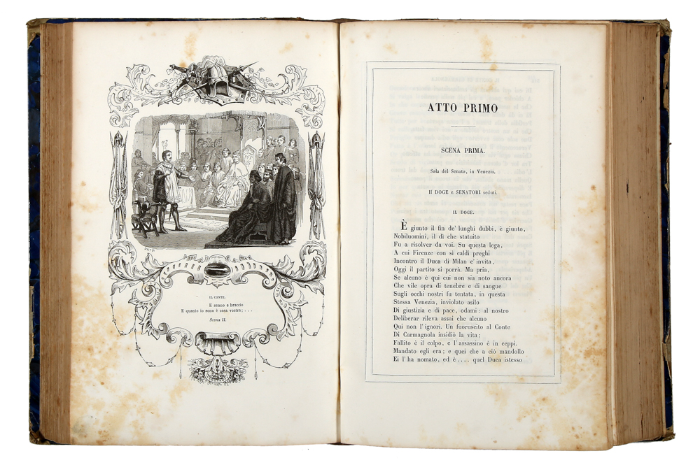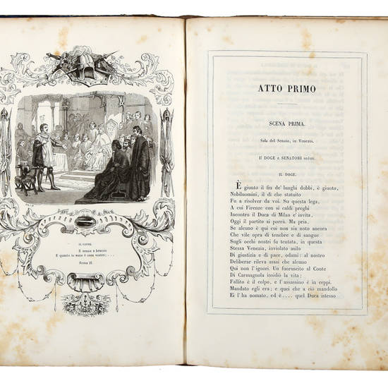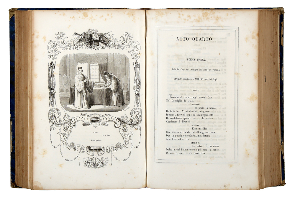 In-4° (mm 270x180), pagine 864, con 10 xilogr. alle Tragedie, inc. da Ratti sui disegni di Roberto Focosi (l'ultimo di Fiorentini), 9 vignette ed altrettanti piccole figure alle iniz. delle poesie (Inni Sacri e poesie storico-politiche), inc. da Ratti e Salvioni sui disegni di Paolo Riccardi e Salvator Mazza. Legatura coeva in mezza pelle, piatti marmorizzati, doppi fili oro sul dorso, qualche arrossatura, ma buon esemplare, a larghi margini.