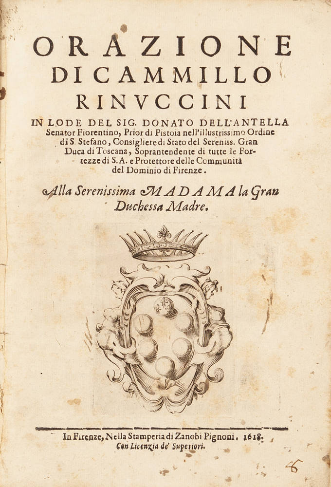 In-4°( mm220x150), Pagine [4], 40, [2] bianche. Sotto il titolo, stemma mediceo, iniziali ornate in xilografia. Esemplare senza il Ritratto di Donato Dell'Antella inciso da Callot. Esemplare con forellini di tarlo marginali e qualche traccia di arrossatura. Cartonato moderno muto.