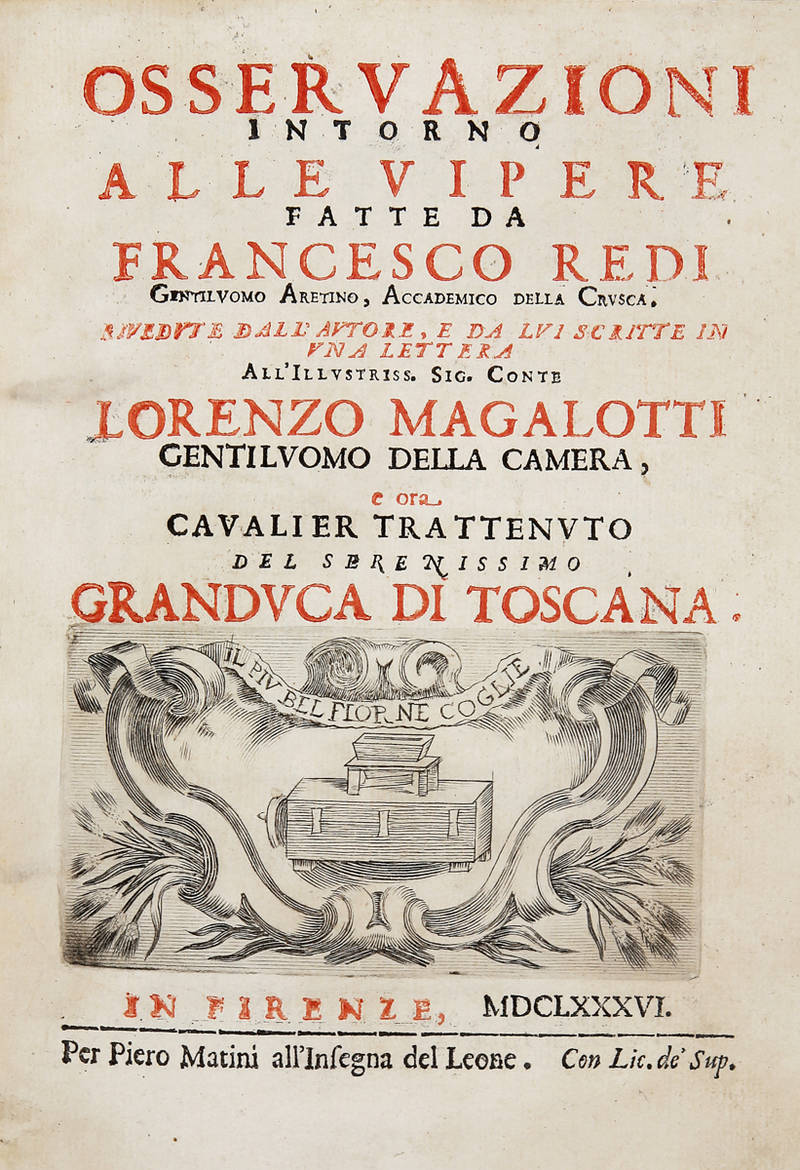 In-4°, pagine 66. Titoli in rosso e nero. Frullone della Crusca al frontespizio e in fine, testate e iniziali figurate. (Segue:) Lettera di F.R. sopra alcune opposizioni fatte alle sue osservazioni intorno alle vipere scritta alli signori Alessandro Moro e abate Bourdelot...In Firenze, per P. Matini, all'Insegna del Leone, 1685. In-4°, pagine 31, [1]. Titoli in rosso e nero; testate e iniziali figurate. Legatura in pergamena molle moderna. Bell'esemplare.
