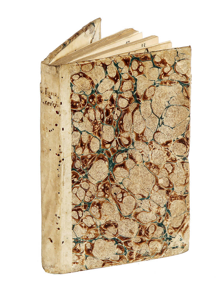 In-8° (mm 150x98), pagine 115, [1], con 12 interessanti tavole fuori testo a piena pagina inc. in rame da Io. Bapt. Sintes. Legatura in mezza pergamena coeva un poco tarlata, piatti in carta marmorizzata. Fori di tarlo ad alcune pagine sparse con perdita di alcune parti di testo. Esemplare con macchie e corto di margini.