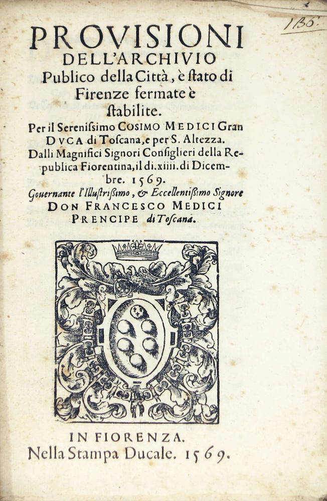 PROVISIONI dell'Archivio Publico della Città, e stato di Firenze fermate e stabilite. Per il Serenissimo Cosimo Medici...dalli Magnifici Signori Consiglieri della Republica Fiorentina, il di. xiiii. di Dicembre 1569...