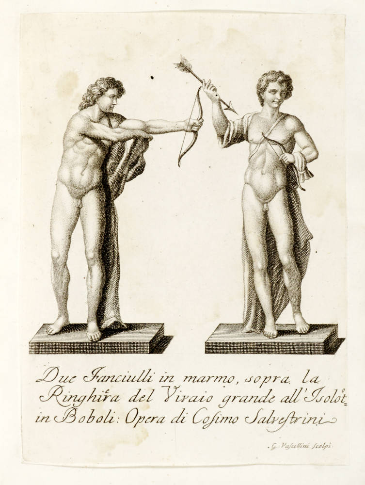Da: Francesco Maria Soldini, Il Real Giardino di Boboli nella sua pianta e nelle sue statue (Firenze, 1789). La serie completa delle incisioni del Vascellini contenute nell'opera, è di 46 tavole. Le Blanc IV, 95, n°44. Moreni II, 350. G. Vascellini (Castello San Giovanni 1745-Firenze 1805). Allievo di Ercole Graziani e di C. Faucci, incise ritratti di illustri personaggi fiorentini e soggetti storici. Benézit X, 405.