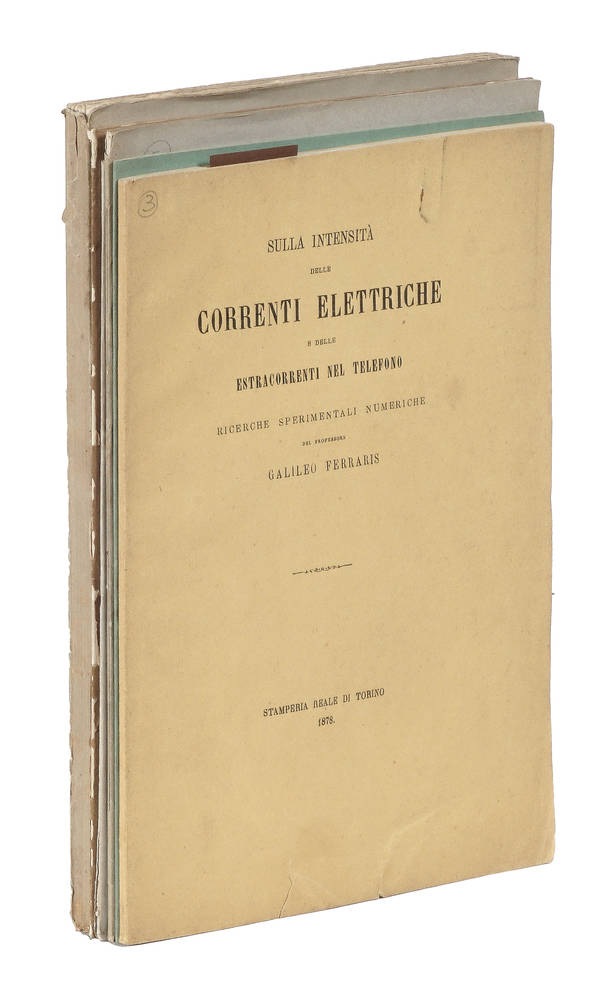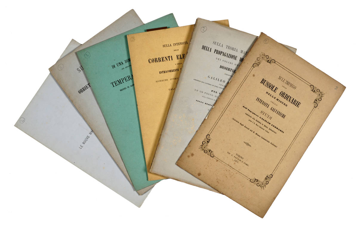6 opuscoli in-8° (mm 240x160) rilegate in brossure originale con titoli impressi al piatto anteriore così composti:-Sull'impiego delle Bussole ordinarie nelle misure delle intensità galvaniche...Torino,Favale, 1871. Pagine 16, con 1 tavola ripiegata.-Sulla teoria matematica della propagazione dell'elettricità nei solidi omogenei. Dissertazione. Torino, Stamperia Reale, 1872. Pagine X, 94.-Sulla intensità delle correnti elettriche e delle extracorrenti nel Telefono. Torino,Stamperia Reale, 1878. pagine 49, con 1 tavola a colori ripiegata.-Di una dimostrazione del pricipio di Helmholtz sulla Tempera dei Suoni ricavata da alcuni esperimenti fatti col telefono. Torino, Stamperia Reale, 1878. Pagine 14, con figure n.t.-Sui Cannocchiali con obbiettivo composto di più lenti...Torino, Loescher, 1880. Pagine 28.-Le nuove macchine di induzione. (Torino, Tip. Camilla e Bertolero, sec. XIX°). Pagine 16, con 1 tavola incisa più volte ripiegata.