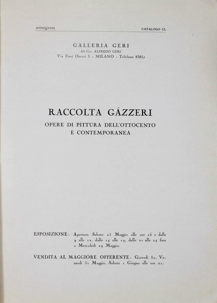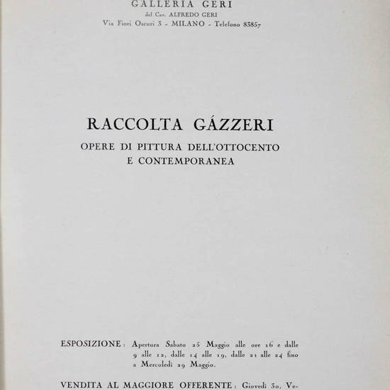 RACCOLTA Gazzeri. Opere di pittura dell'Ottocento e contemporanea. Galleria Geri. Esposizione 25 maggio e 29 maggio. Anno XVIII.