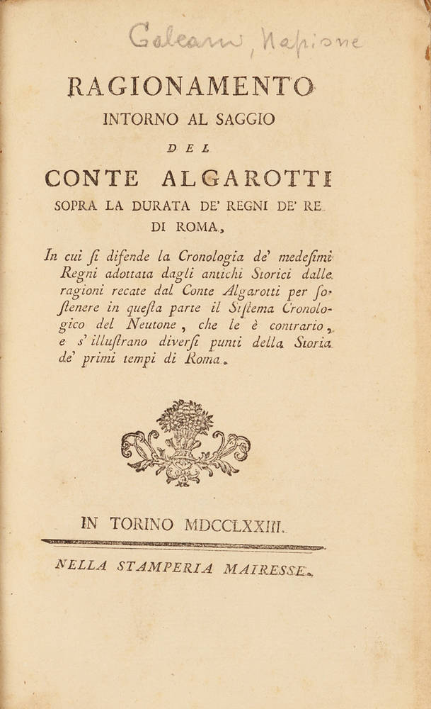 Interessante trattato storico sul saggio del conte Algarotti riguardante i regni dei re di Roma. L'opera si apre con una dedica dell'autore, Gianfrancesco Napione Galeani, a Vittorio Amedeo di Savoia, re di Sardegna. Melzi II, 406.