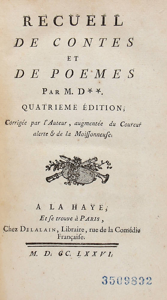 Recueil de contes et de poemes par M.D.++. Quatrième édition, corrigée par l'Auteur, augmenté e du Coureur alerte et de la Moissonneuse.