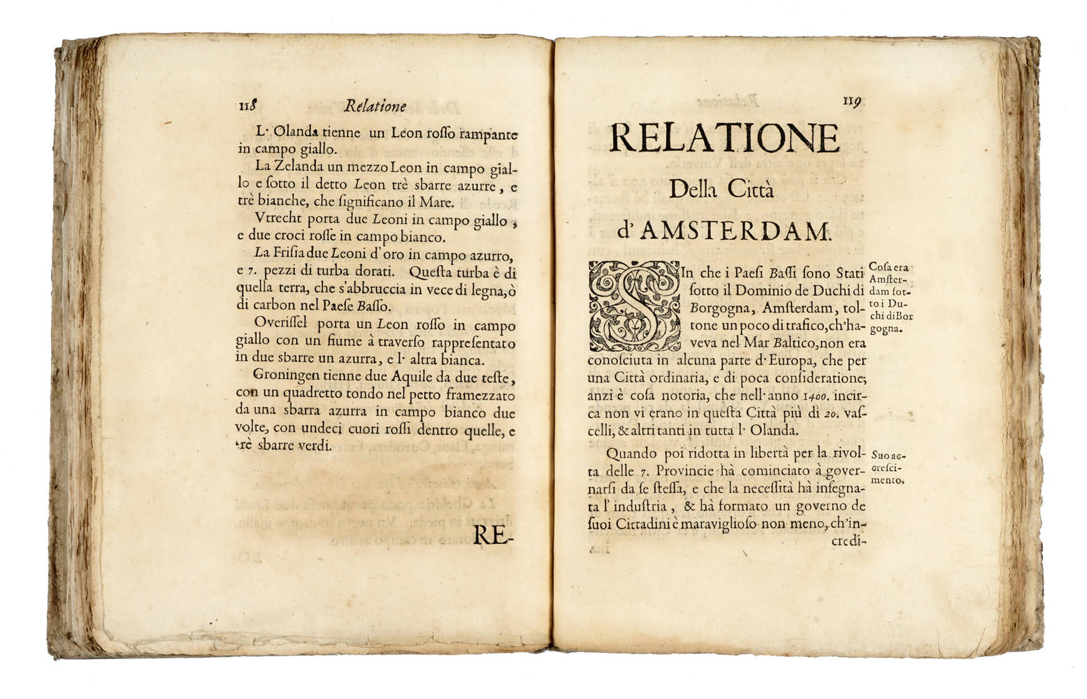 Prima edizione non comune, manca a Brunet e Graesse. A pagina 119 e sgg. importante "Relatione della Città d'Amsterdam". Piantanida, 1343: "Prima edizione".