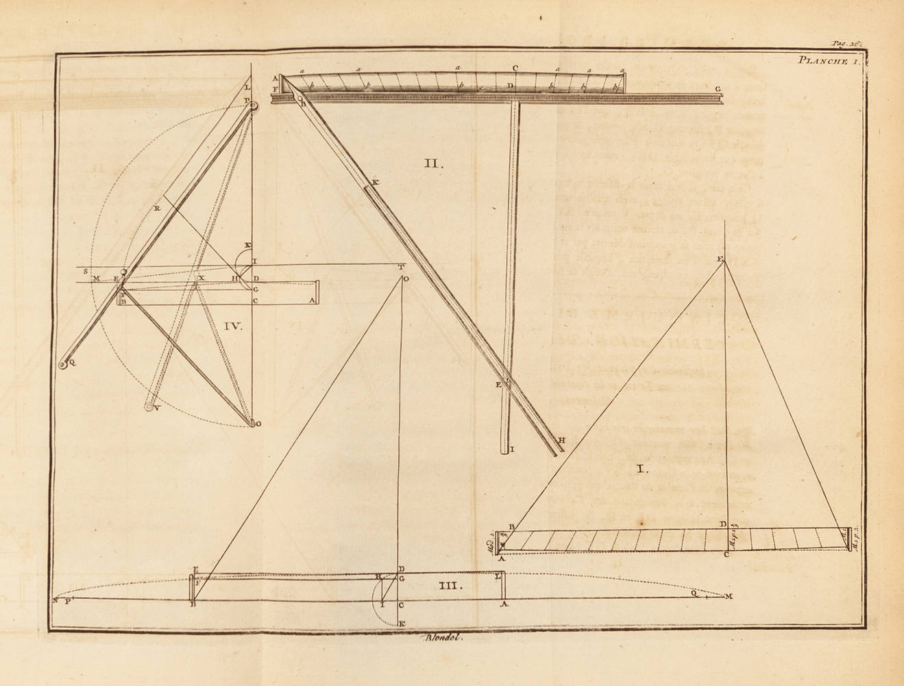 Ristampa de L'Aja. Scritto nella stessa epoca del suo Corso d'architettura che doveva diventare il testo definitivo dell'architettura in Francia, Blondel si dedica, in quest'opera, ai problemi di disegnare colonne, archi rampanti e raggi d'uguale resistenza, riguardo agli ultimi dei quali, persistè nel fraintendimento di Galileo. Quest'opera di Blondel è contenuta anche in Memoires de l'Academie Royale des Sciences...Tome Second (cfr. anche: Carli-Favaro, 446).