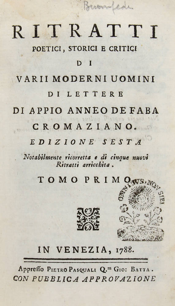Ritratti poetici, storici e critici di varii moderni uomini di lettere di Appio Anneo De Faba Cromaziano. Edizione sesta...di cinque nuovi ritratti arricchita.